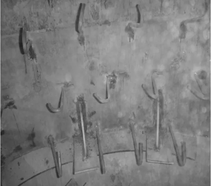 (4)原錨固件為Y銷釘,每隔150mm交錯布置,銷釘端部沒有鋼筋網(wǎng)格,使耐火材料無法形成整體,個別銷釘失效后會使局部耐火材料松動,相鄰耐火材料之間沒有可靠聯(lián)系,終脫落。